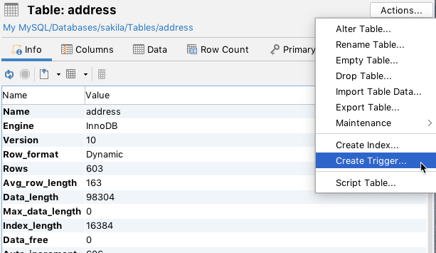 The right-click menu in the Databases tab is context sensitive meaning that the listed actions in the menu depends on the selected object type.
