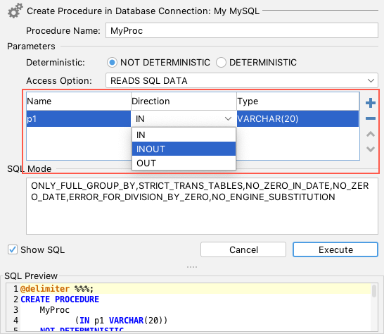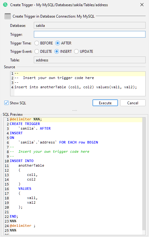 | mode | - script show the action dialog, process user input and send the final SQL to the SQL Commander without executing the command - script-immediate will not show the action dialog but instead pass the final SQL directly to the SQL Commander without executing the command | Specifies how the action will be prepared and displayed |
