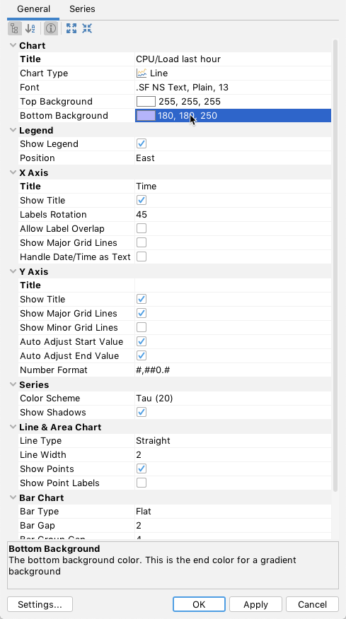 The chart viewer presents a result set as a chart. This is typically useful for displaying monitoring metrics, statistics, and any result set from a query from the database. Using it with the layout attribute for the ObjectView element allows creating dashboards with charts and other viewers.