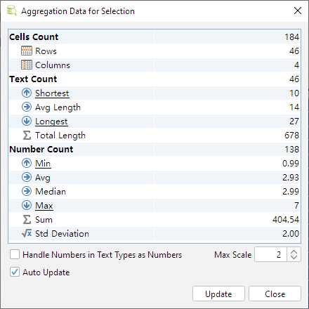 With Auto Update checked, the data is updated automatically when you change the selection in the grid. For very large selections, you may prefer to disable this feature and instead click Update when you want to refresh the data. Click a link (blue underlined text) in the aggregation table to locate and highlight the actual value in the source data grid. The Handle Number Values in Text Types as Numbers setting simply treats all valid numbers in text data types as numbers and include them in the Number Count summary.