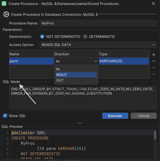 The figure shows the use of separators and two fields that extend to the full width of the action dialog. The separators for Parameters and SQL Mode are here used as alternatives to labels for the fields below them.