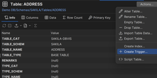 In DbVisualizer, the object actions menu is accessed via the right-click menu in the Databases tab or via the Actions button in the object view.