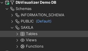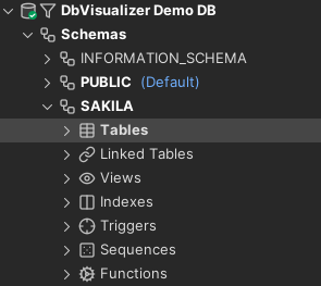 The previous image shows the object types available under a Schema in H2. As you can see, there are plenty of them (sub object types are collapsed in the example for better illustration). The following example shows the database tree in the Databases tab before and after the visibility has been set based on the previous screenshot.