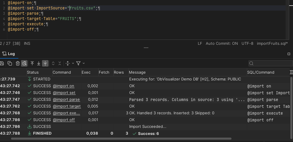 Instead of using the GUI to import data you can use client-side commands to import data, i.e @import. This enables you to use the DbVisualizer command-line interface to automate your imports and utilise other client-side commands such as @export, @mail, among others. Import data using the @import command supports the following formats: