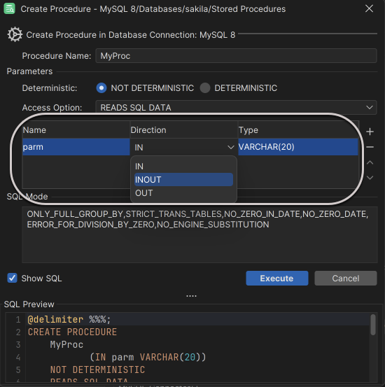 The figure shows the use of separators and two fields that extend to the full width of the action dialog. The separators for Parameters and SQL Mode are here used as alternatives to labels for the fields below them.