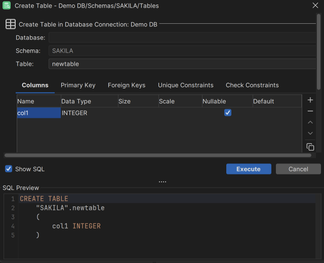 The first field in the dialog, Database Connection, is always present and shows the alias of the database connection the current object is associated with. At the bottom, there is a Show SQL control that, when checked, displays the final SQL for the action. The bottom right buttons are used to run the action ( the label of the button may be Execute or Script based on the action mode), or to Cancel the action completely.