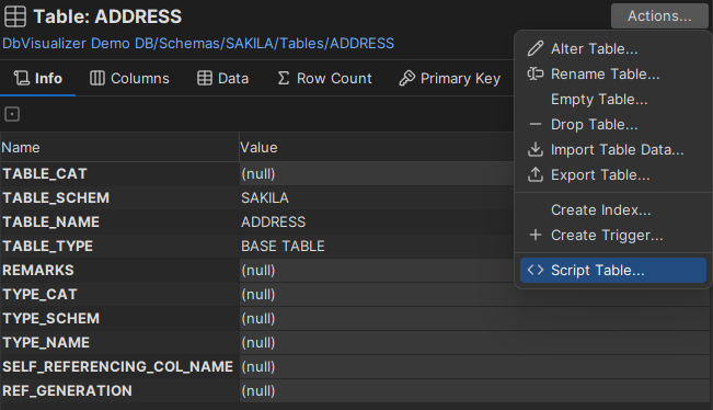 In DbVisualizer, the object actions menu is accessed via the right-click menu in the Databases tab or via the Actions button in the object view.