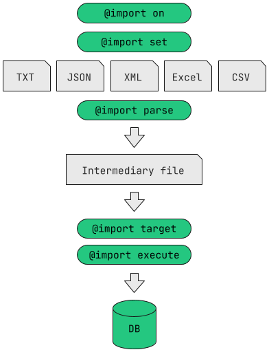 The @import parse step (1) lays the foundation for the database import as it based on the source file format (csv, json, xlsx, etc), parses the data to an intermediary and internal file. This file is then analyzed to detect widths, data types and their sizes based on the data, row and cell references back to the source file, and a lot more.