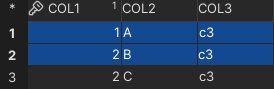 | Copy Selection as IN Clause with OR (ANY) | Copy selected cells, formatted as a clause to select rows where ANY of the selected values match. Example: (col1 IN (1, 2))This is similar to Copy Selection as IN Clause, but is slightly more efficient in some situations; in this example, col3 is matched using equals (=) rather than IN since the selected rows have the same value in this column. This is different from Copy Selection as IN Clause with AND (ALL) since the clause matches any column value on each row; it will select a row with column values 1, B, c3. |