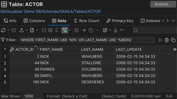 If you modify the column visibility in the Data tab, the changes persist throughout the session. For instance, if you remove the ACTOR_ID column in the Data tab for the table Actor, the ACTOR_ID column remains excluded when you reload the table or come back to the Data tab for that table later in the same session. You must manually make it visible again to bring it back. The changes are, however, reset when you restart the application. If you modify the column visibility in the Log tab in the SQL Commander, the changes will affect the Log tab immediately and other SQL Commander Log tabs the next time they are opened or refreshed by running a query. Any custom column setups are saved individually for the Log tab in SQL Commander, Actions, Export (all but export grid), Import, and Procedure Editor.