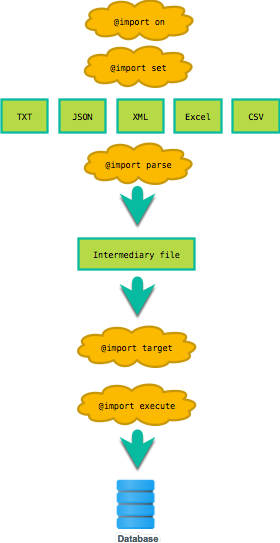 The @import parse step (1) lays the foundation for the database import as it based on the source file format (csv, json, xlsx, etc), parses the data to an intermediary and internal file. This file is then analyzed in order to detect widths, data types and their sizes based on the data, row and cell references back to the source file, and a lot more.