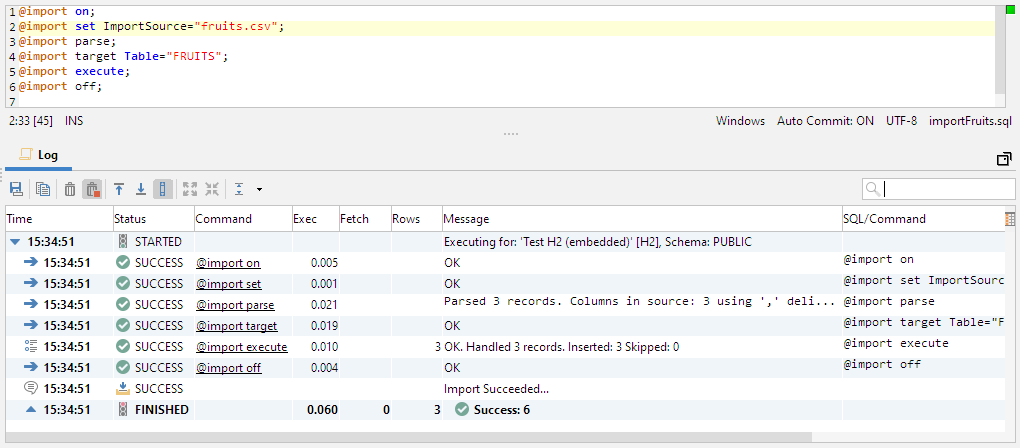 As seen in the screen-shot above 3 records were inserted and and 1 was skipped (the header).