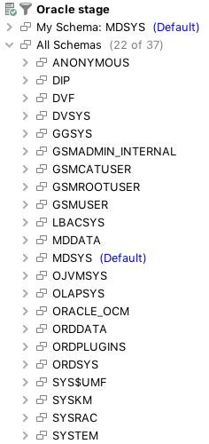 Consider the following example showing the objects tree (for Oracle) with the Schemas node being expanded to show all schemas in the database: