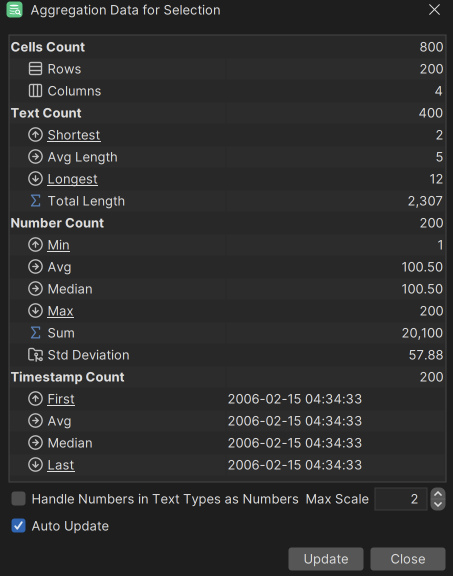 With Auto Update checked, the data is updated automatically when you change the selection in the grid. For very large selections, you may prefer to disable this feature and instead click Update when you want to refresh the data. Click a link (blue underlined text) in the aggregation table to locate and highlight the actual value in the source data grid. The Handle Number Values in Text Types as Numbers setting simply treats all valid numbers in text data types as numbers and include them in the Number Count summary.