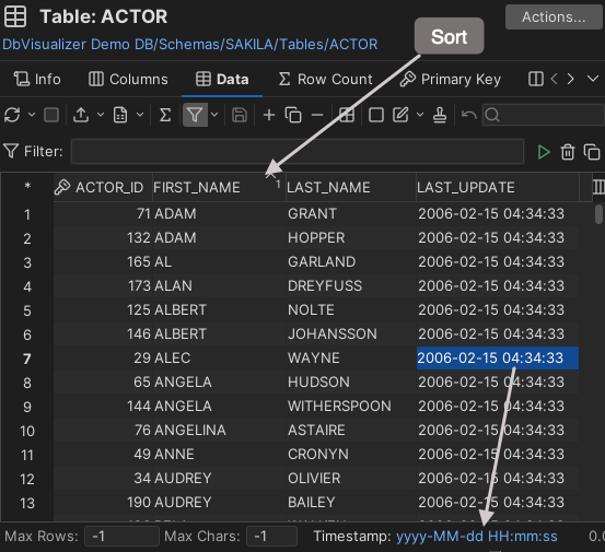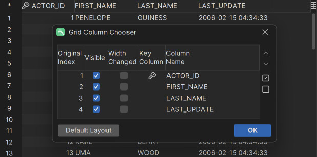 If you modify the column visibility in the Data tab, the changes persist throughout the session. For instance, if you remove the ACTOR_ID column in the Data tab for the table Actor, the ACTOR_ID column remains excluded when you reload the table or come back to the Data tab for that table later in the same session. You must manually make it visible again to bring it back. The changes are, however, reset when you restart the application. If you modify the column visibility in the Log tab in the SQL Commander, the changes will affect the Log tab immediately and other SQL Commander Log tabs the next time they are opened or refreshed by running a query. Any custom column setups are saved individually for the Log tab in SQL Commander, Actions, Export (all but export grid), Import, and Procedure Editor.
