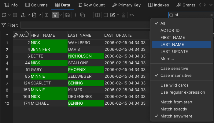 Use the Quick Filter pull-down menu (click on the magnifying glass) to choose if the filter should match cells in all columns or just one selected column, case or case insensitive matching, and where in the cell the value must match.
