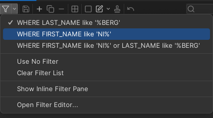 The top entries in the menu are previously used filters for the table, if any. The checkbox is selected for the filter that is currently in use. The filters are saved between DbVisualizer sessions, and you can toggle between them by selecting them from the menu. The maximum number of filters to save is specified in the Tool Properties dialog, in the Table Data category under the General tab.