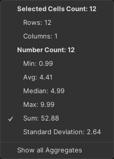 The aggregation status bar can show up to three metrics for the current selection. It is updated even when the aggregation viewer is not displayed. The default is to show the summary of numbers in the selected cells.